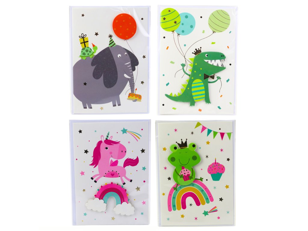 - Pohádkové vzory jako jednorožec, dinosaurus, slon a žába dodávají kartě veselý charakter a činí ji ideální pro narozeniny, svátky, gratulace nebo jiné události