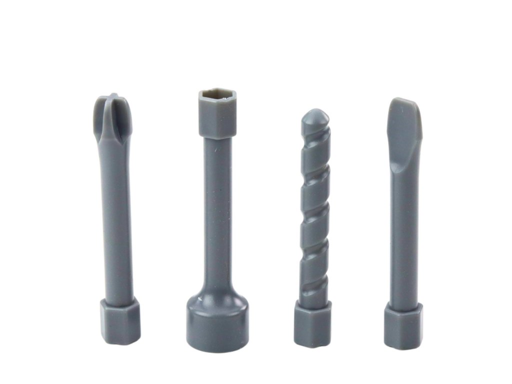- Vyměnitelné bity: Obsahuje vrták, plochý šroubovák, křížový nástavec a klíč pro různé úkoly