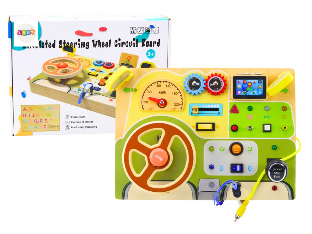 Panel je vybaven různými komponenty, jako jsou tlačítka, ovládací knoflíky, posuvníky a barevná LED světla, která svítí v různých barvách a přitahují pozornost nejmladších Každý z interaktivních prvků napodobuje skutečné funkce v automobilech, což dělá hračku velmi realistickou a poutavou