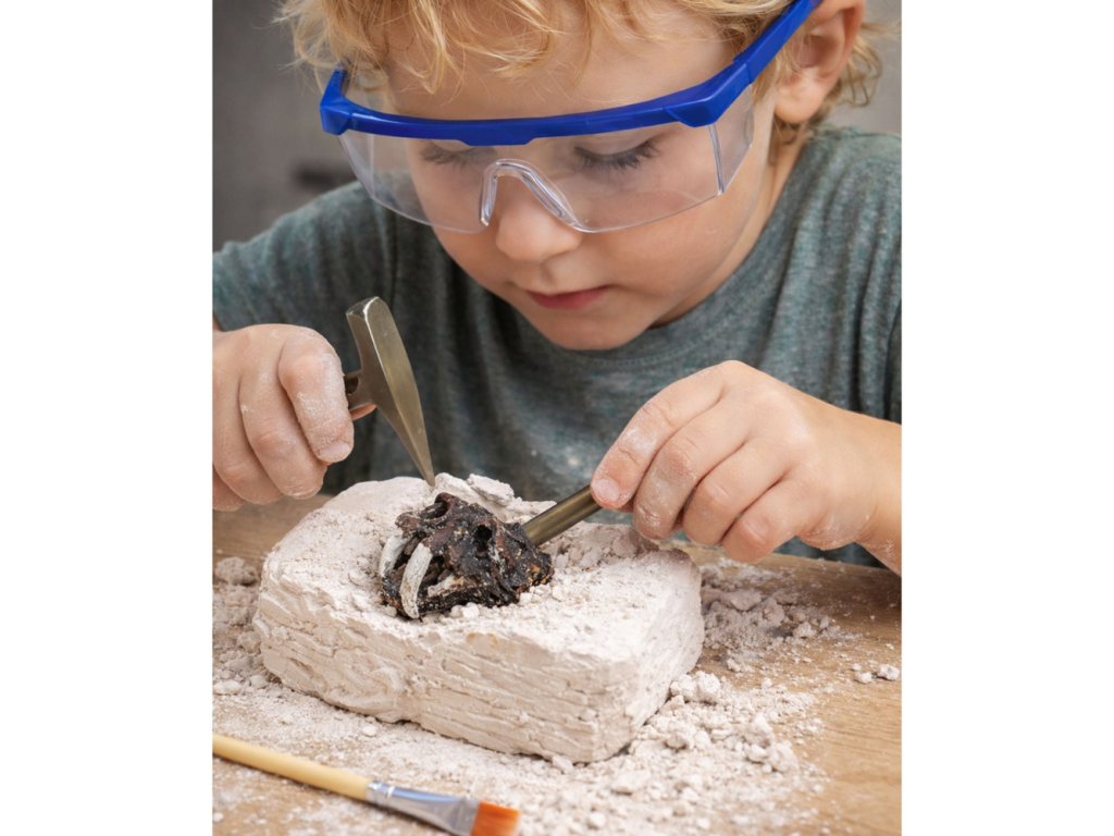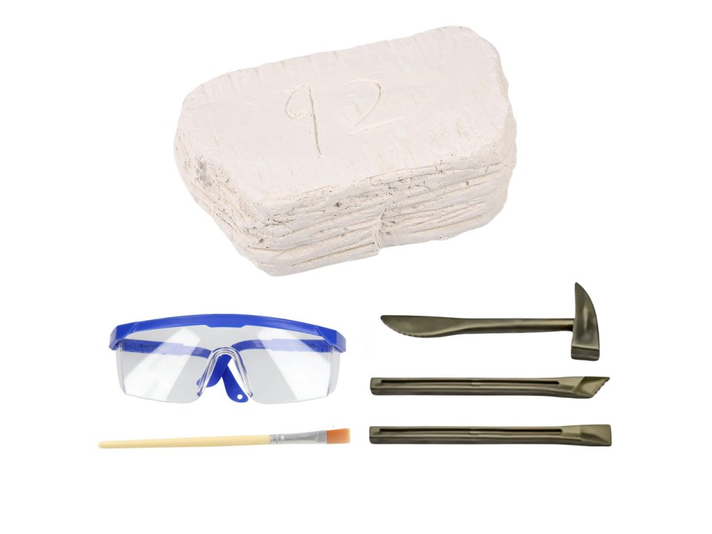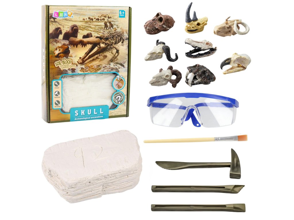 - **Obsah balení**: Sádrový blok s lebkou, 2 dláta, kladívko, štětec, ochranné brýle.