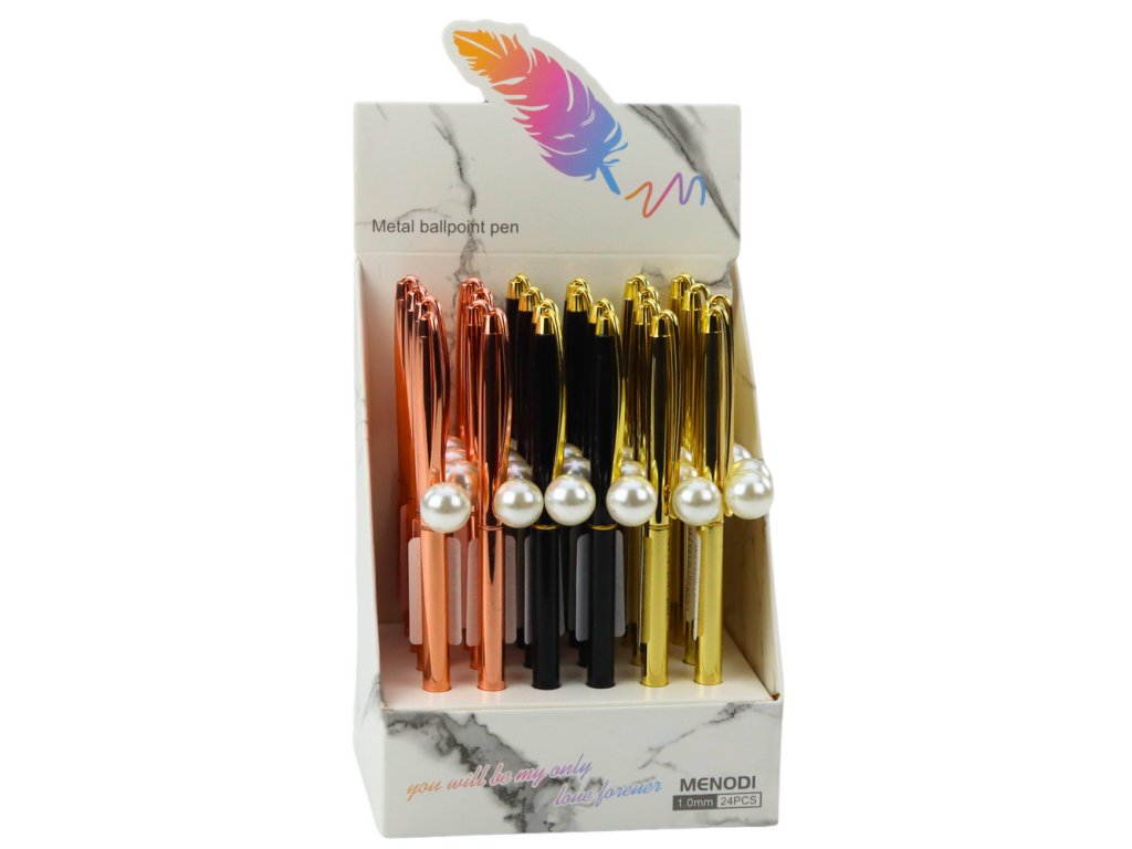 Automatické kovové pero Perla Elegantní kovové pero s ozdobným zakončením ve tvaru velké perly představuje výjimečný doplněk do kanceláře, školy nebo pro každodenní použití.