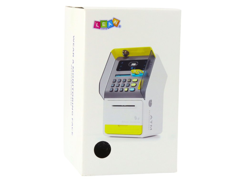 Numerická klávesnice, slot na kartu a mezery na bankovky a mince věrně reprodukují funkce skutečného bankomatu Hračka je zabezpečena PIN kódem a simulací rozpoznávání tváře