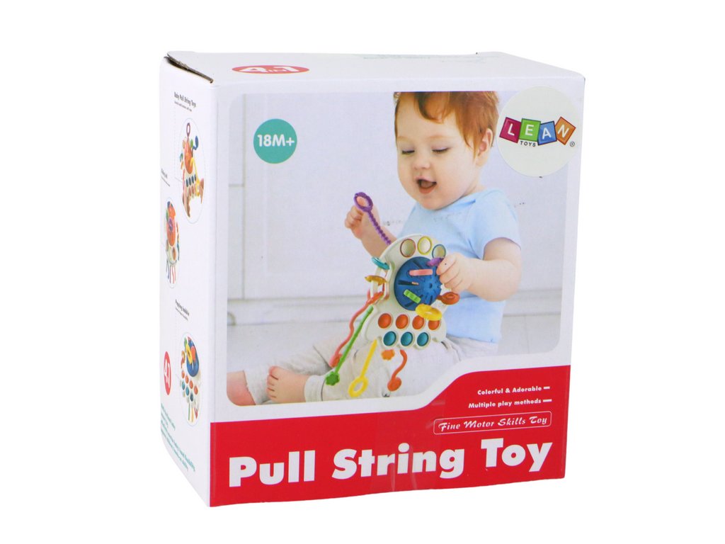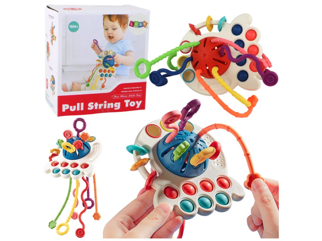 - Rozvojová hračka: Zapojí dítě pomocí interaktivních prvků, jako je přetahování vláken a mačkání bublin, což stimuluje motorické schopnosti a rozvoj dotykového vnímání