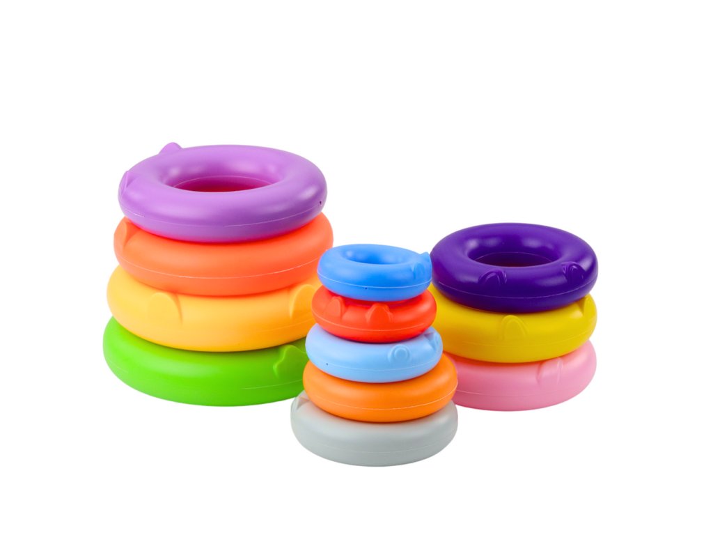 - Skládání kruhů ve správném pořadí podle velikosti a učení se barvám a sekvencím jsou skvělá cvičení na podporu rozvoje jemné motoriky, koordinace oko-ruka, stejně jako příčinného myšlení a rozpoznávání vzorů