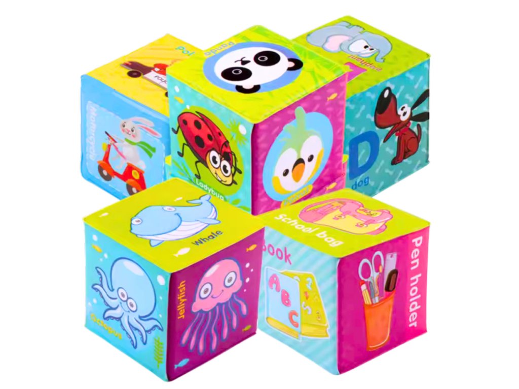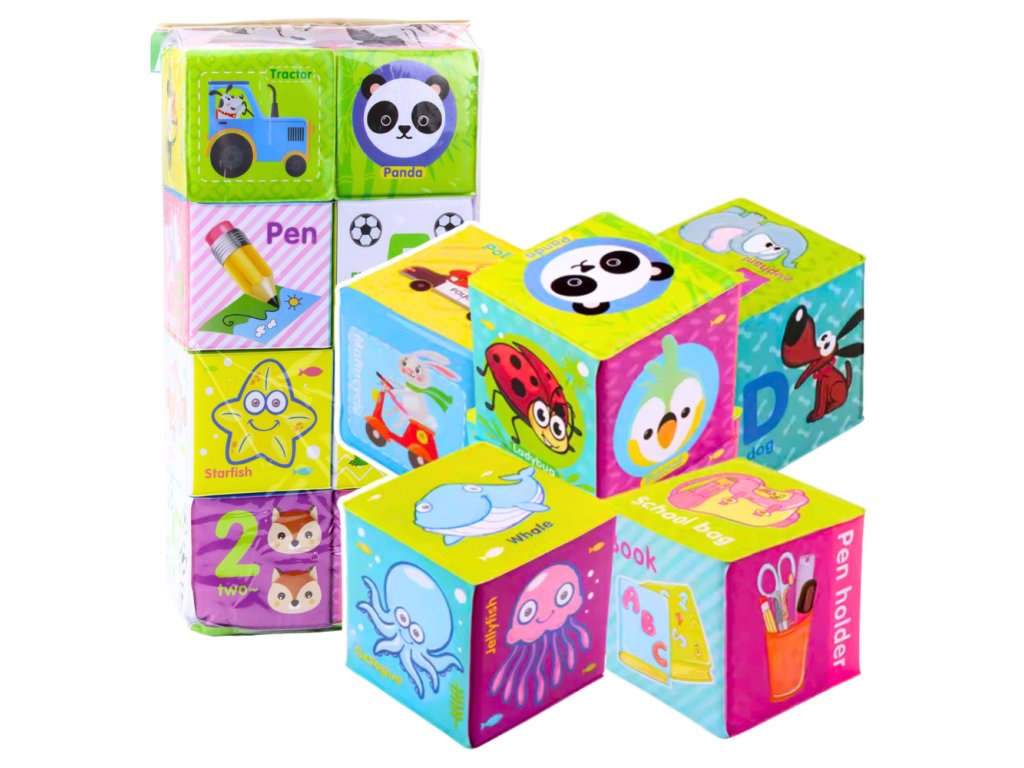 - Kostky lze skládat, mačkat, házet, poznávat dotekem a sledovat vzory a barvy, což stimuluje smysly dítěte a přispívá k rozvoji jemné motoriky