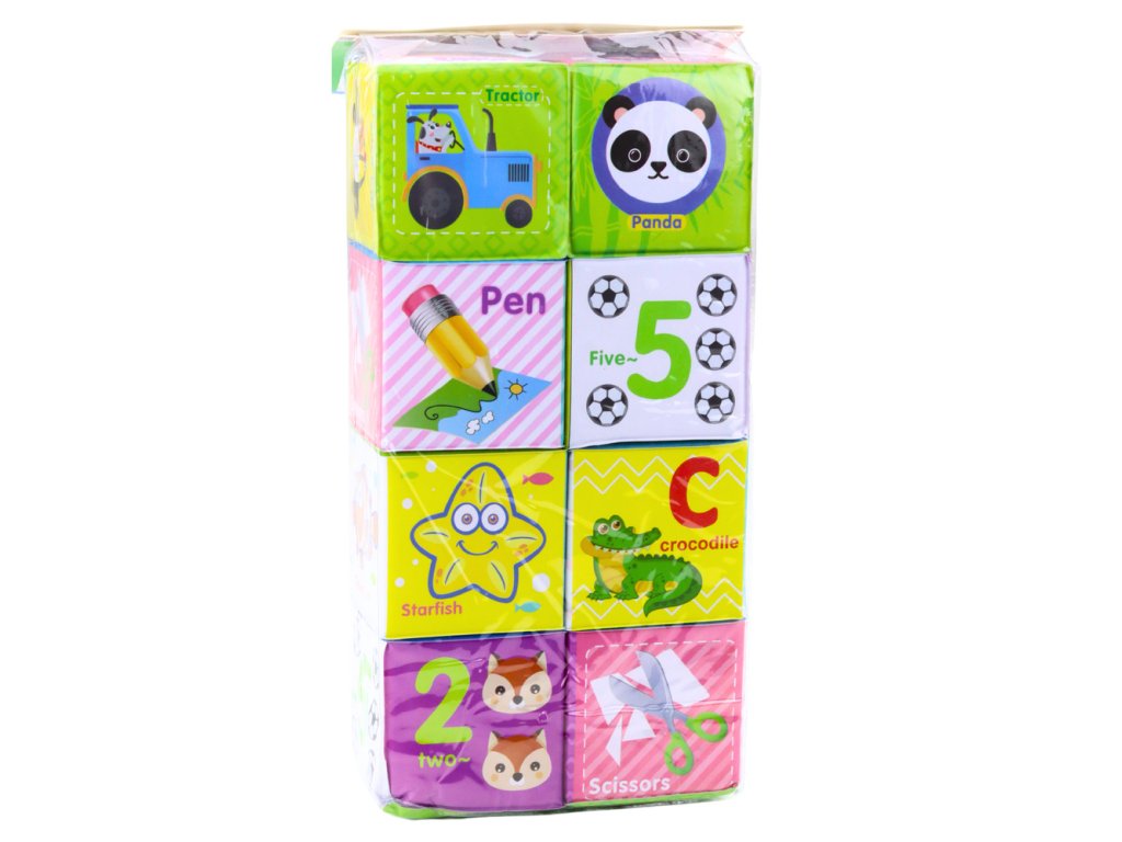 - 8 měkkých kostek, které najdete v sadě, je vyrobených z bezpečného a příjemného materiálu ke hraní a poznávání