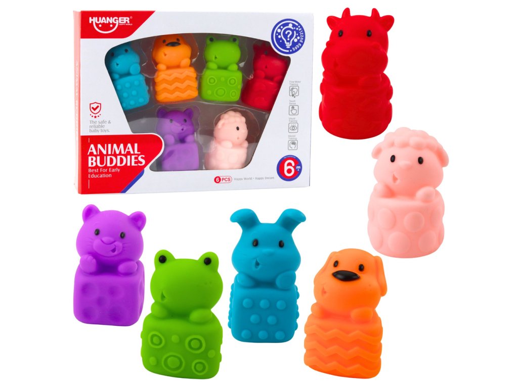 V sadě naleznete 6 barevných zvířátek, jako jsou zelená žabka, oranžový pejsek, červený hroch, růžová ovečka, fialová kočka a modrý králíček Každá postavička je přibližně 8 cm vysoká a perfektně padne do malých dětských rukou