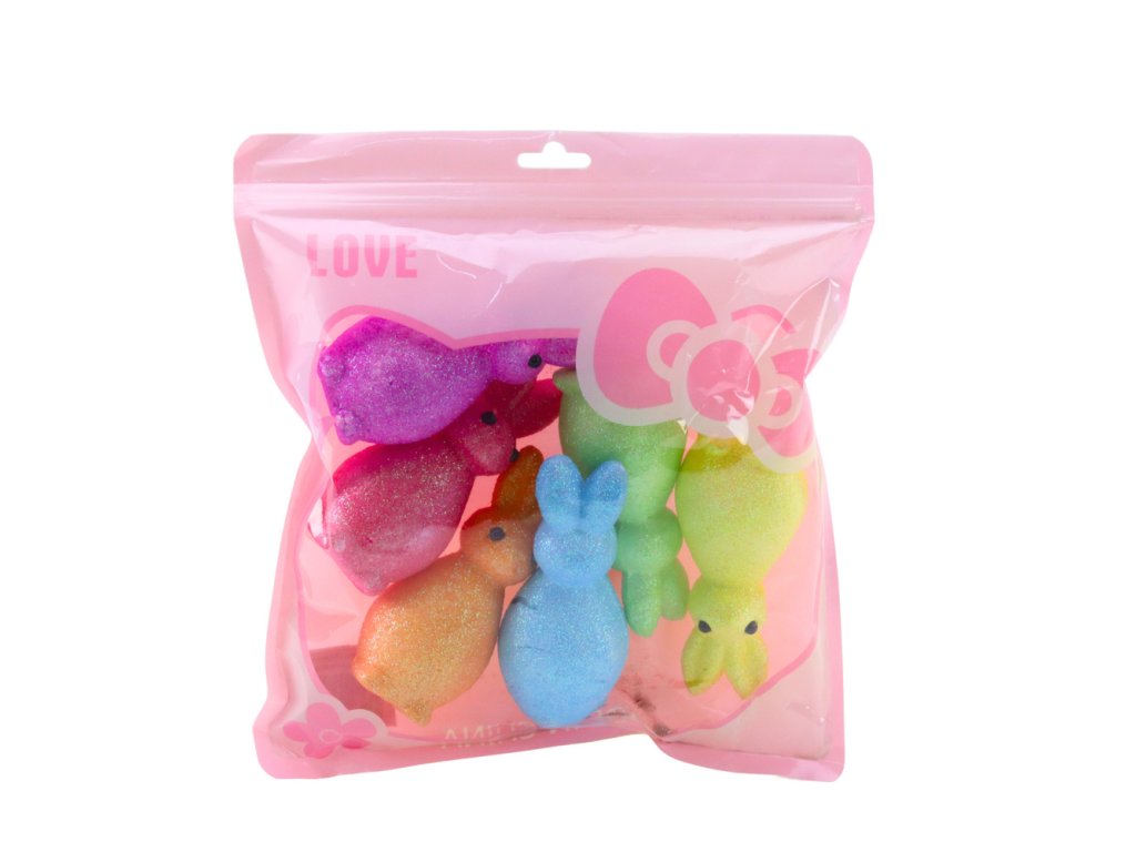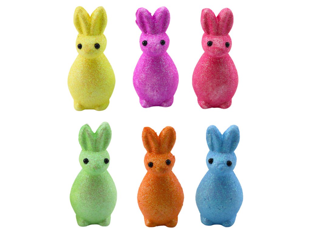 - Sada obsahuje 6 zajíčků pokrytých třpytkami v barvách: žlutá, modrá, růžová, zelená, oranžová a fialová
