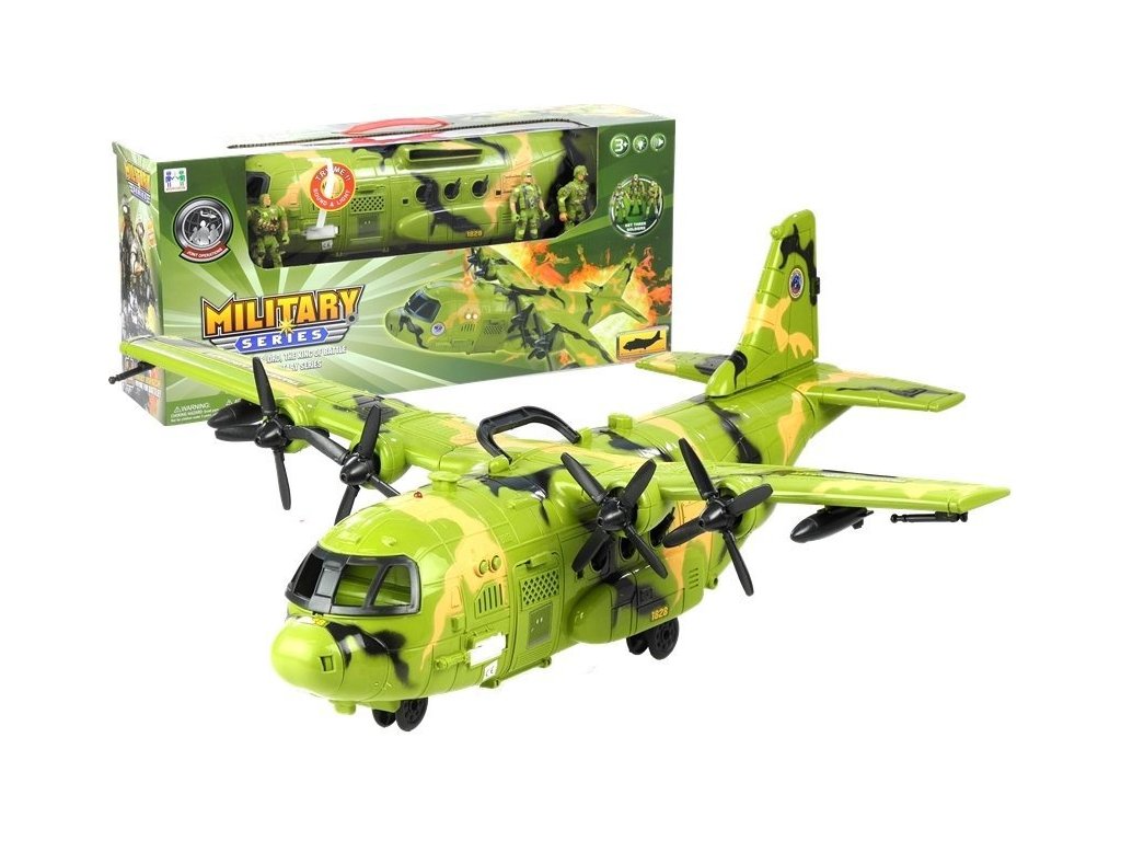 Obrovský vojenský letoun s světelnými a zvukovými efekty je ideální hračkou pro všechny malé kluky, kteří si rádi hrají na vojáky. Díky prvkům obsaženým v sadě může dítě během hry zaujmout roli pilota obrovského vojenského letounu i ostatních členů posádky. Tyto prvky rozšiřují možnosti hry a lze je kombinovat s dalšími hračkami, které malý fanoušek armády již má ve své sbírce. Sada obsahuje: