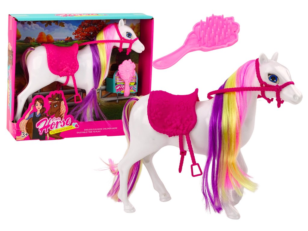 Figurka koně Bílý kůň na česání Sedlo Stáj Farma Cute Horse ⭐ Roztomilá figurka koně v bílé barvě, která potěší každou malou milovnici koní! Hřebenatelný kůň s krásnou barevnou hřívou a ocasem, který umožňuje vytvářet kreativní účesy pomocí přiloženého kartáče