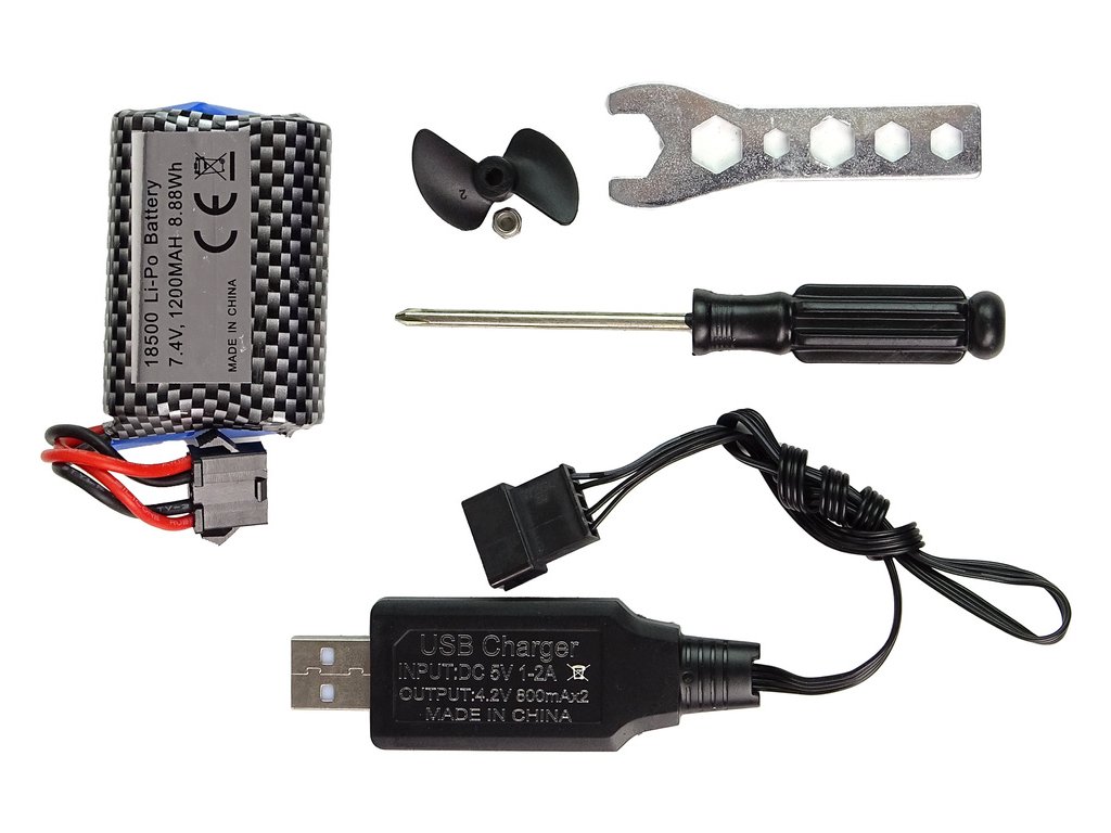 - Tento motorový člun je vybaven baterií, která je součástí balení, a je připraven na vzrušující jízdu