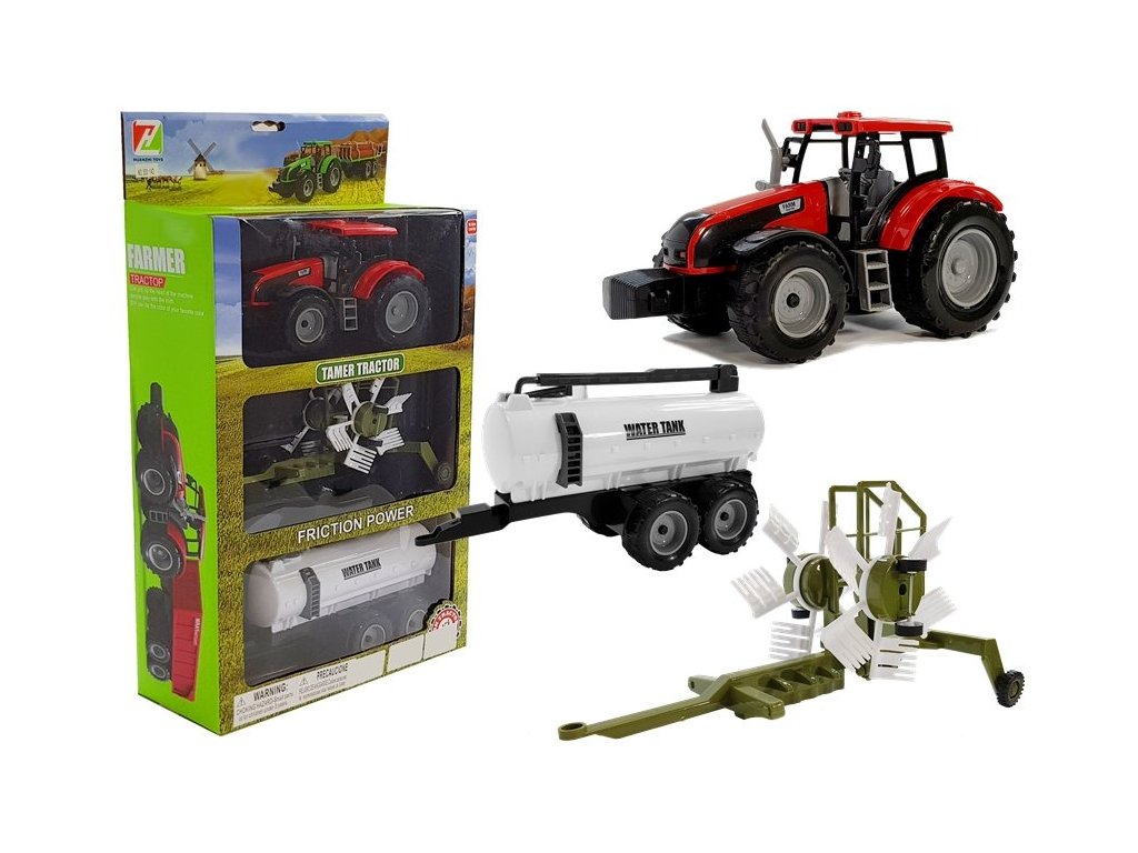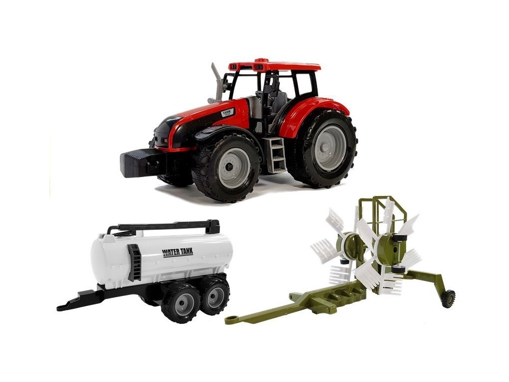 - Traktor s přívěsem, shrnovačem a cisternou červený Při domácí inscenaci vašeho dítěte snadno pochopí, jak vypadá život plný povinností na farmě, a navíc objeví zajímavou zábavu na dlouhé hodiny