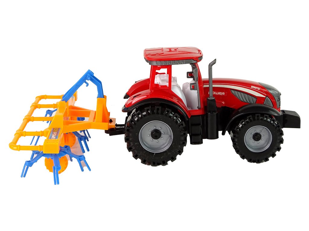 Červený traktor s hrabací radlicí a frikčnímpohonem Hra s zemědělskými stroji je pro děti skvělou zábavou.