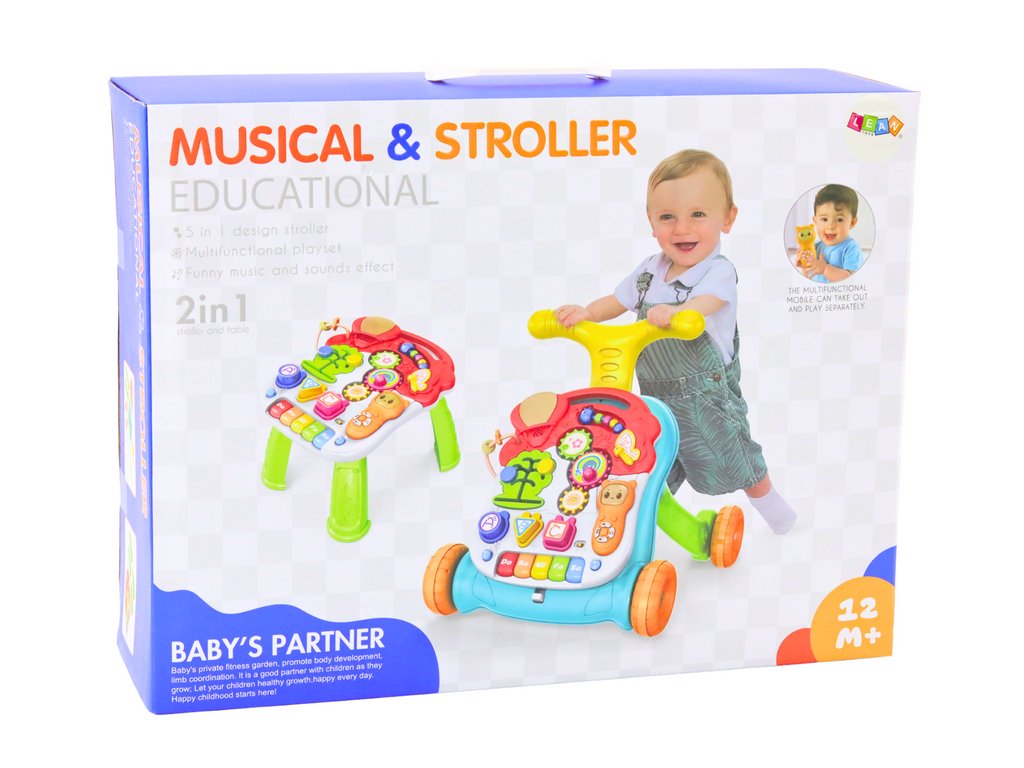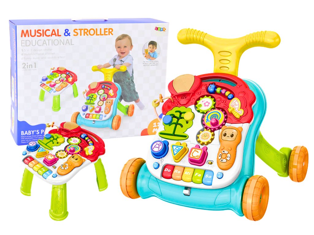 Chodítko a stolek v jednom, interaktivní a vzdělávací pomůcka pro děti, která podporuje jejich rozvoj na mnoha úrovních, od kognitivních a motorických po hudební a senzorické dovednosti Hračka může sloužit jako stolek s nohami i bez nich, což rodičům umožňuje přizpůsobit ji preferencím a potřebám dítěte a prostoru