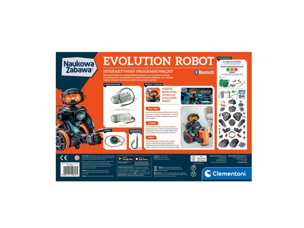 Dopřejte svým dětem dobrodružství s Evolution Robot 2.0 od Clementoni! Je ideální pro lehkou a zábavnou výuku technologií. Sestavení a programování robota rozvíjí jejich dovednosti. Set zahrnuje: