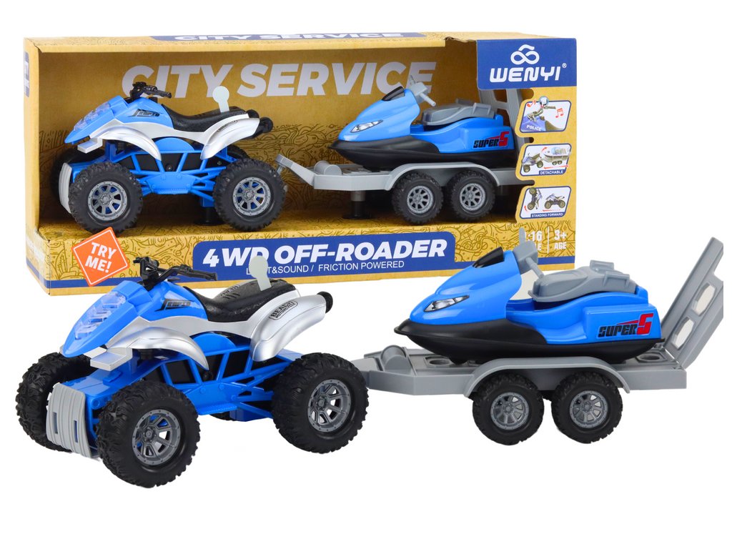 Čtyřkolka s přívěsem pro přepravu lodí a vodním skútrem je realisticky zpracovaný model tvořený čtyřkolkou dlouhou 17 cm, ideální pro dynamické akce.