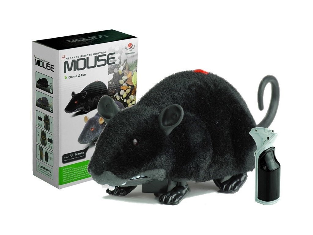 Myš je potažena černým materiálem, který je jemný a příjemný na dotek, takže působí dojmem, že má opravdovou srst Černá hračka ve tvaru myši je ovládána infračerveným ovladačem, což umožňuje hrát si s ní po celém bytě a dělat různé lumpárny