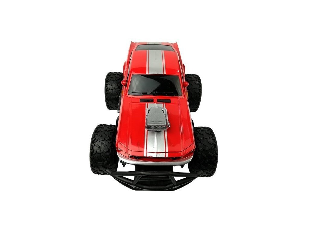 Dálkově ovládané auto R/C s vysokými koly, červené Terénní auto, které překoná každou překážku Skvěle si poradí jak na asfaltu, tak na nerovných kamenech nebo lesní podložce