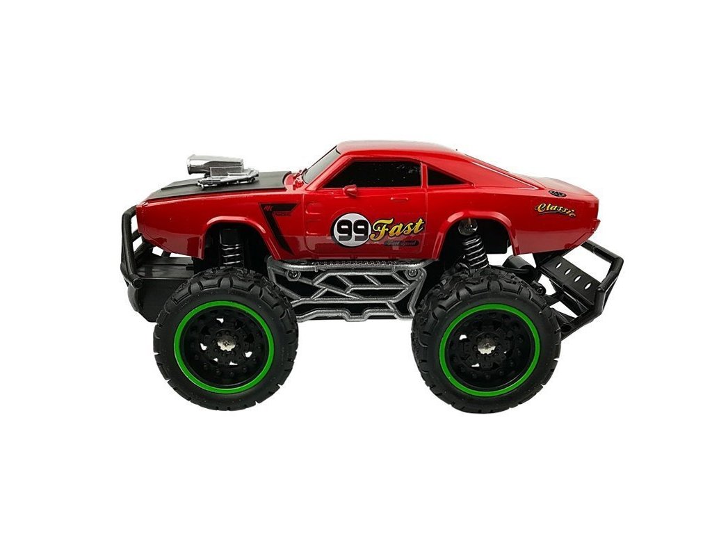 Dálkově ovládané auto R/C s vysokými koly, červené Terénní auto, které překoná každou překážku Skvěle si poradí jak na asfaltu, tak na nerovných kamenech nebo lesní podložce