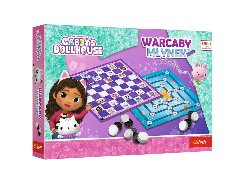 - Ponořte se do kouzelného světa Gabby's Dollhouse s deskovými hrami warcaby a mlýnek od Trefl 02800