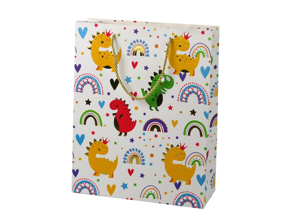 - Dárková taška Barevné dinosaury Duha 32 cm x 26 cm x 10 cm Dárková taška s motivem dinosaurů je jedinečným způsobem, jak zdůraznit radost a barevnou atmosféru při obdarovávání blízké osoby