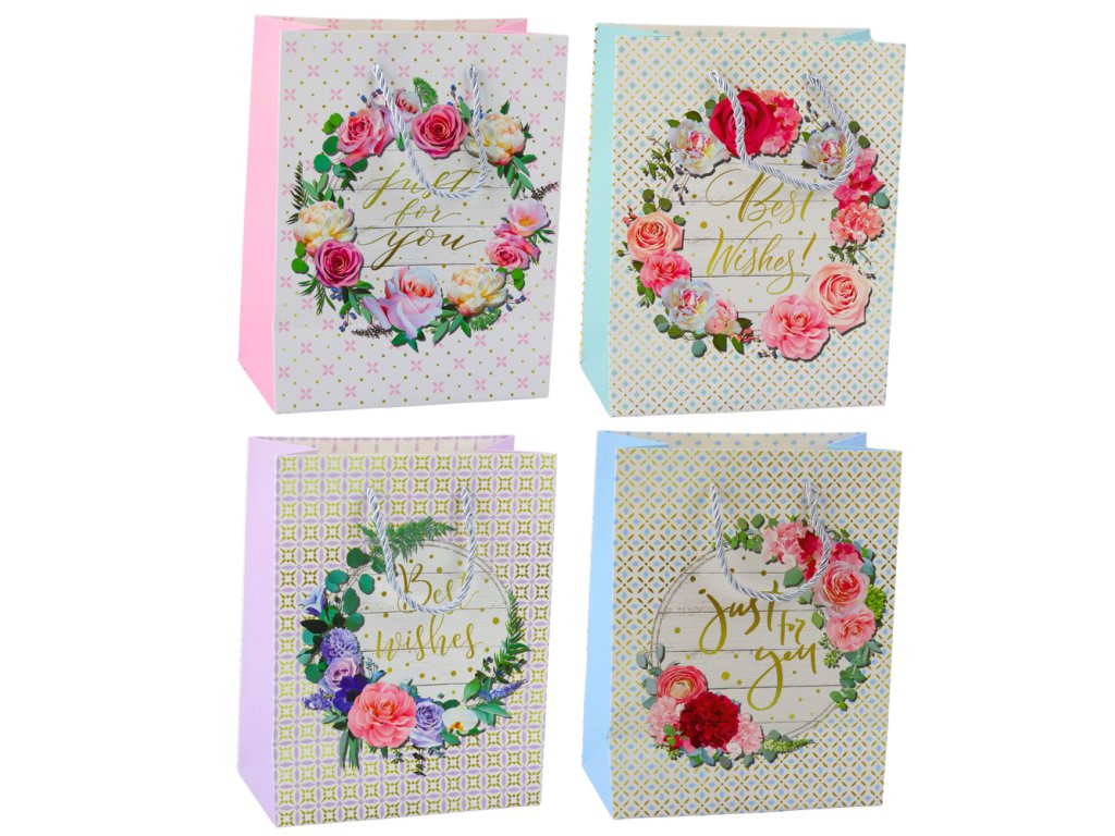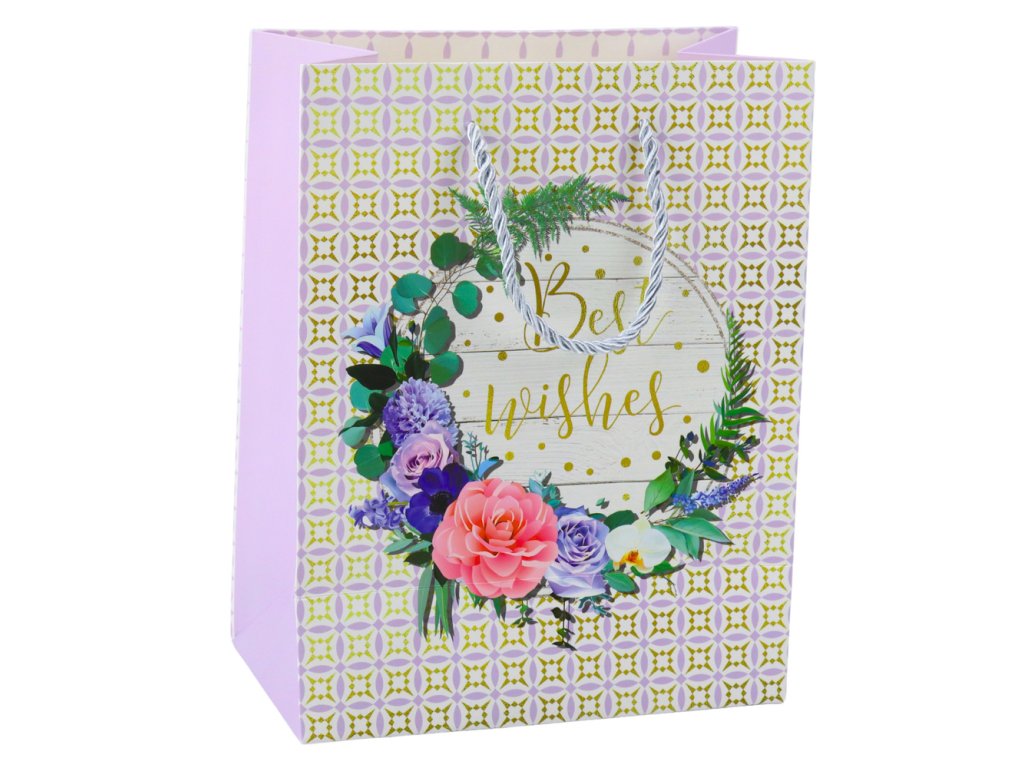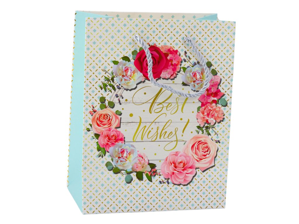 Elegantní dárková taška s romantickým a květinovým vzorem je ideální volbou pro výjimečné příležitosti, jako jsou narozeniny, výročí, svatby či jmeniny Jemné květinové kompozice obklopují zlatý nápis "Best Wishes", který dodává kouzlo a podtrhuje výjimečnost daru