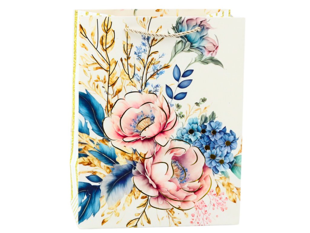 Velký, efektní květinový motiv v dominantních odstínech růžové, modré a zlaté vypadá nesmírně stylově a klasicky, vytváří harmonickou kombinaci barev a detailů Taška je vyrobena z vysoce kvalitního papíru, který zajišťuje trvanlivost a odolnost proti pomačkání