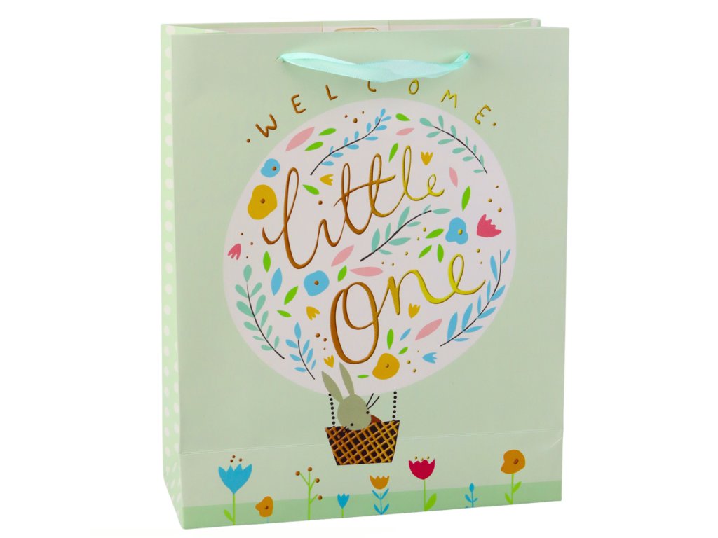 Dárková taška na narození zelená Unikátní dárková taška Welcome Little One je skvělým způsobem, jak elegantně a roztomile zabalit dárek k příležitosti narození dítěte, křtu nebo prvních narozenin Jemná, pastelová barva v kombinaci s květinovými motivy a sladkou grafikou balónu s králíčkem v koši vytváří příjemný a radostný vizuální efekt