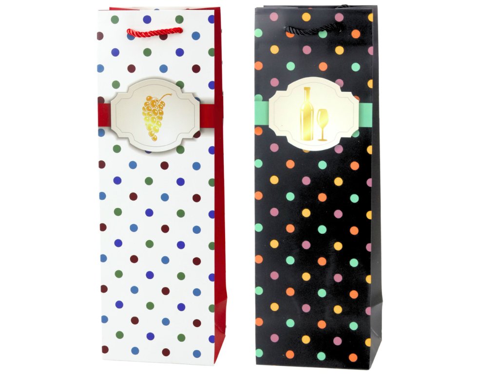 - Naše dárková taška na víno s barevnými puntíky a zlatým motivem je přesně to, co potřebujete!