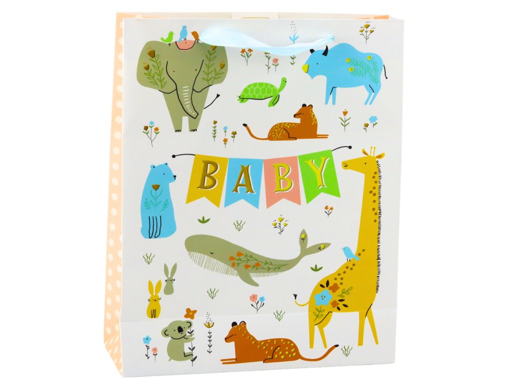 - Tato rozkošná taška s nápisem „BABY“ a veselými zvířátky je výjimečným způsobem, jak zabalit dárek