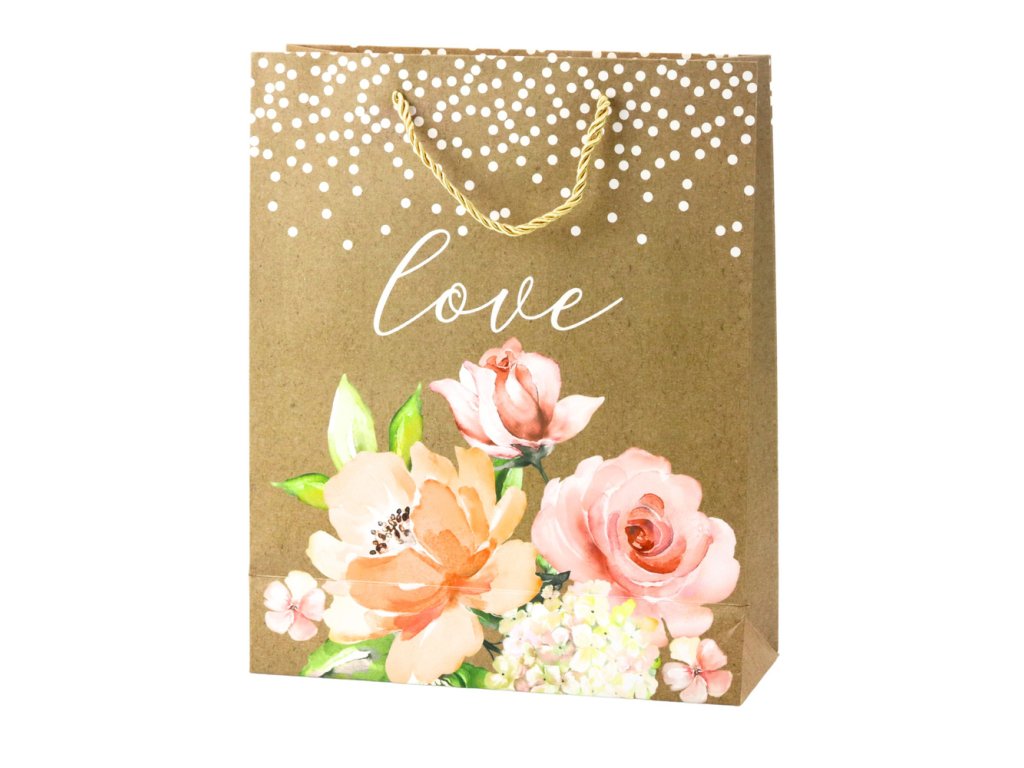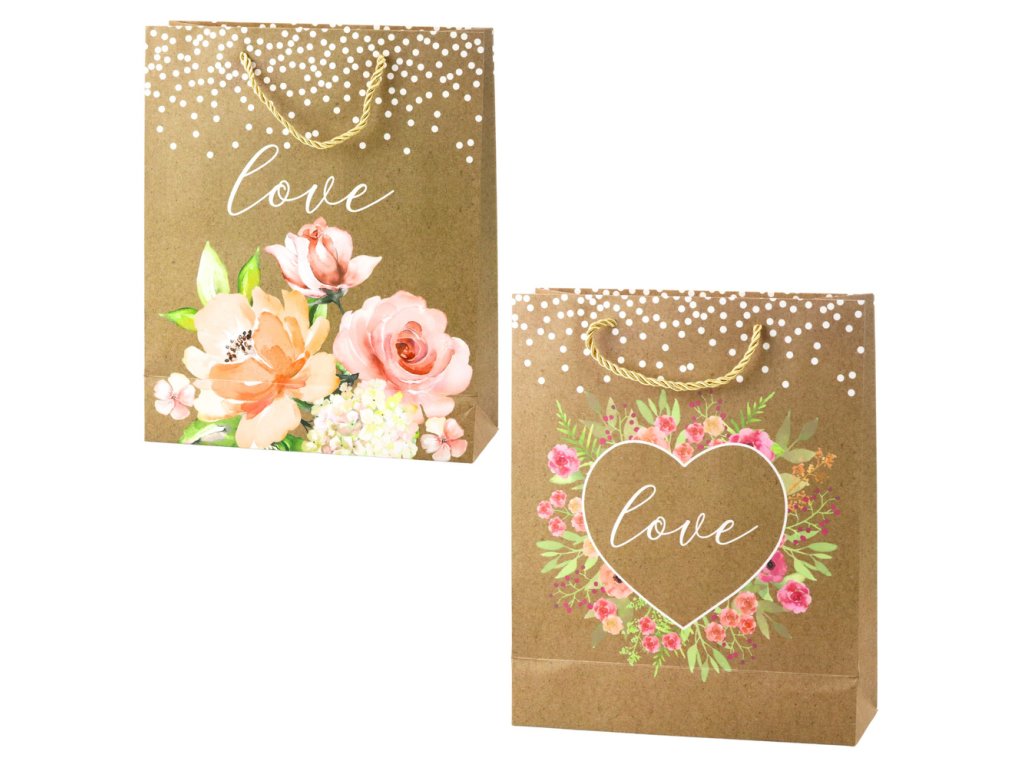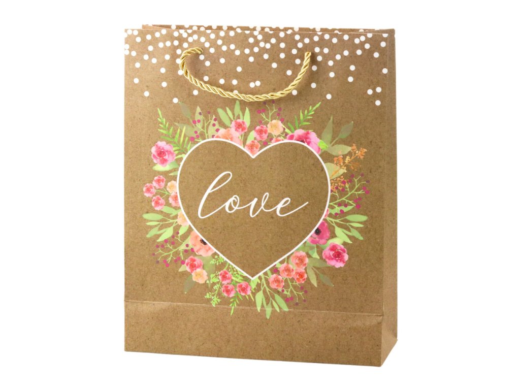 - Dárková taška s nápisem "Love" a květinami Výjimečná dárková taška s přirozeným, rustikálním vzhledem je skvělou volbou pro různé příležitosti, jako je svatba, výročí