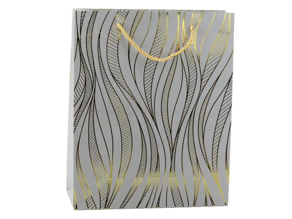 - Vyrobena z vysoce kvalitního ozdobného kartonu, taška se vyznačuje vlnitým zlatým vzorem, který jí dodává jedinečný a luxusní charakter