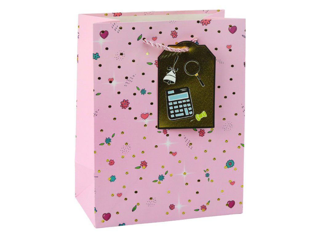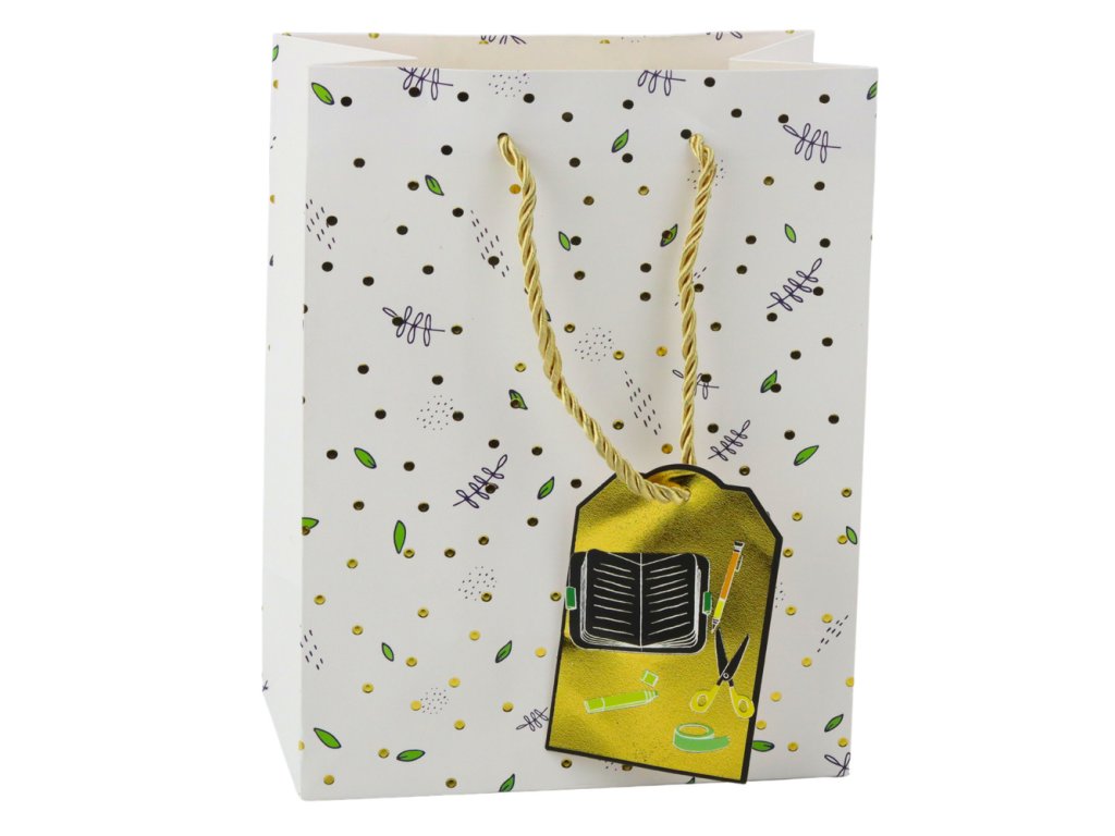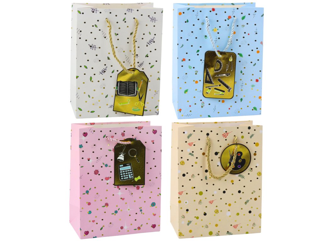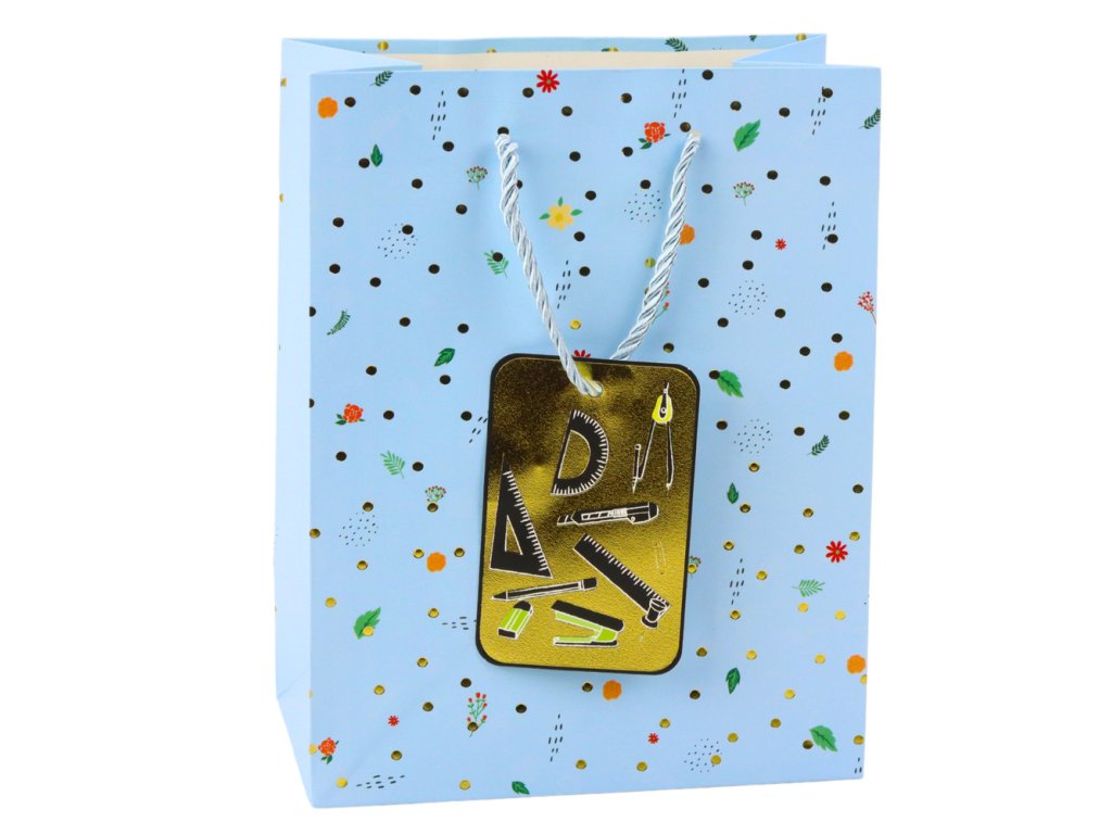 Elegantní dárková taška v pastelových barvách s výjimečnými, zlatými akcenty je ideální volbou pro dárek u příležitosti zahájení školního roku, dokončení studia nebo narozenin studenta Jemný a zároveň moderní vzor inspirovaný školními motivy upoutá pozornost a dává dárku jedinečný charakter