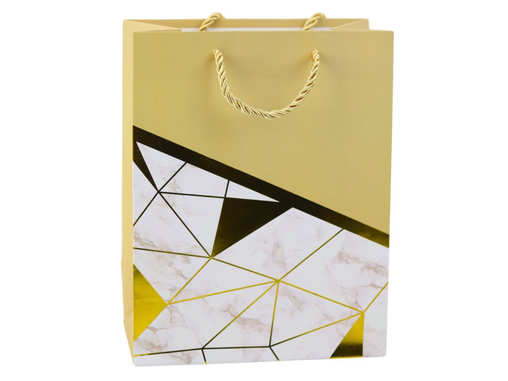 - Vyrobená z vysoce kvalitního ozdobného kartonu, taška vyniká stylovým spojením geometrických vzorů v odstínech mramoru a zlaté barvy