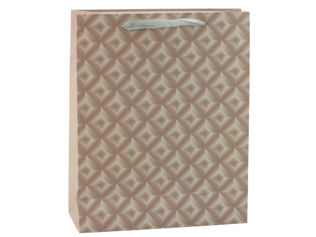 - Její kvalitní a zpevněný papír je ozdoben reliéfním geometrickým vzorem, který dodává tašce luxusní vzhled a krásně odráží světlo