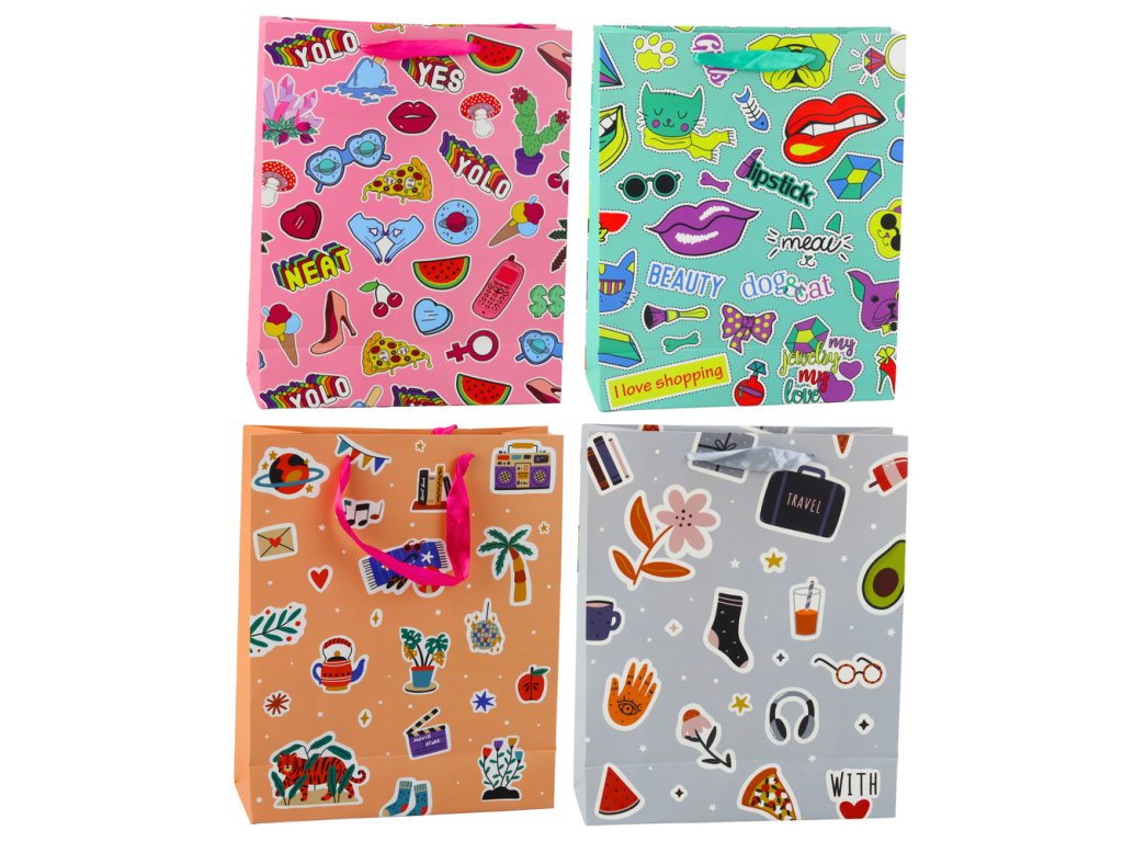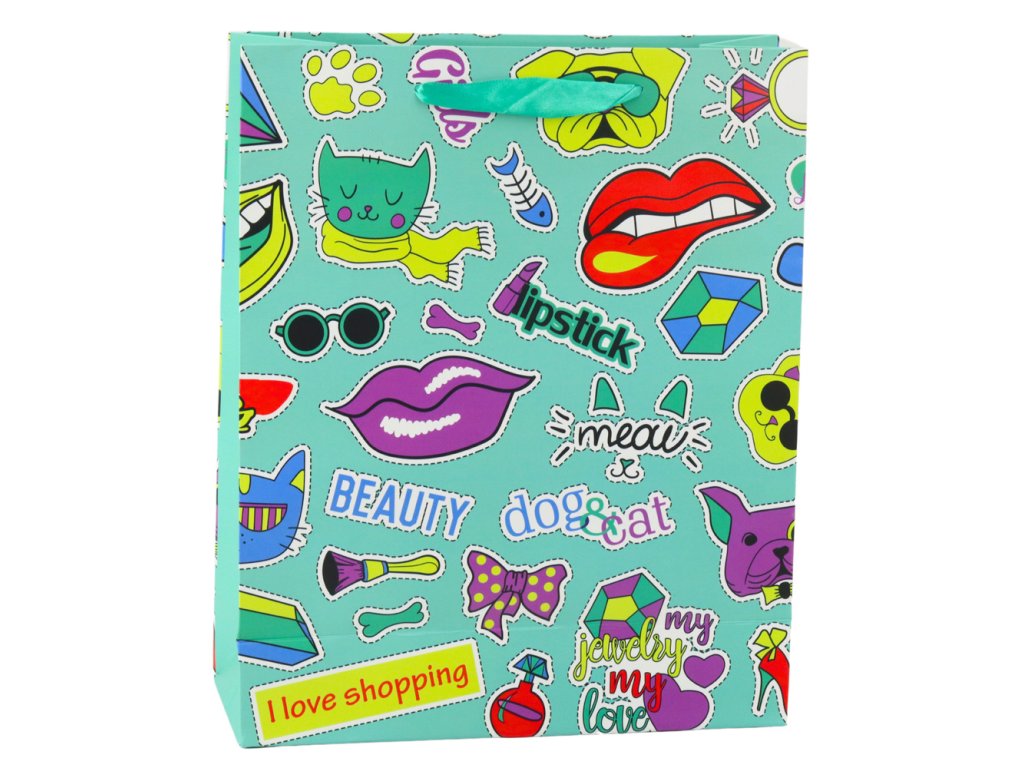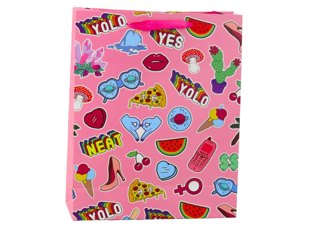 Prezentová taška s motivem samolepek je taška, která okouzlí pestrými barvami a moderním stylem Taška je ozdobena různorodými grafikami ve formě barevných samolepek, jako jsou srdce, rty, ovoce, nápisy a symboly pro mladé a lifestylové motivy