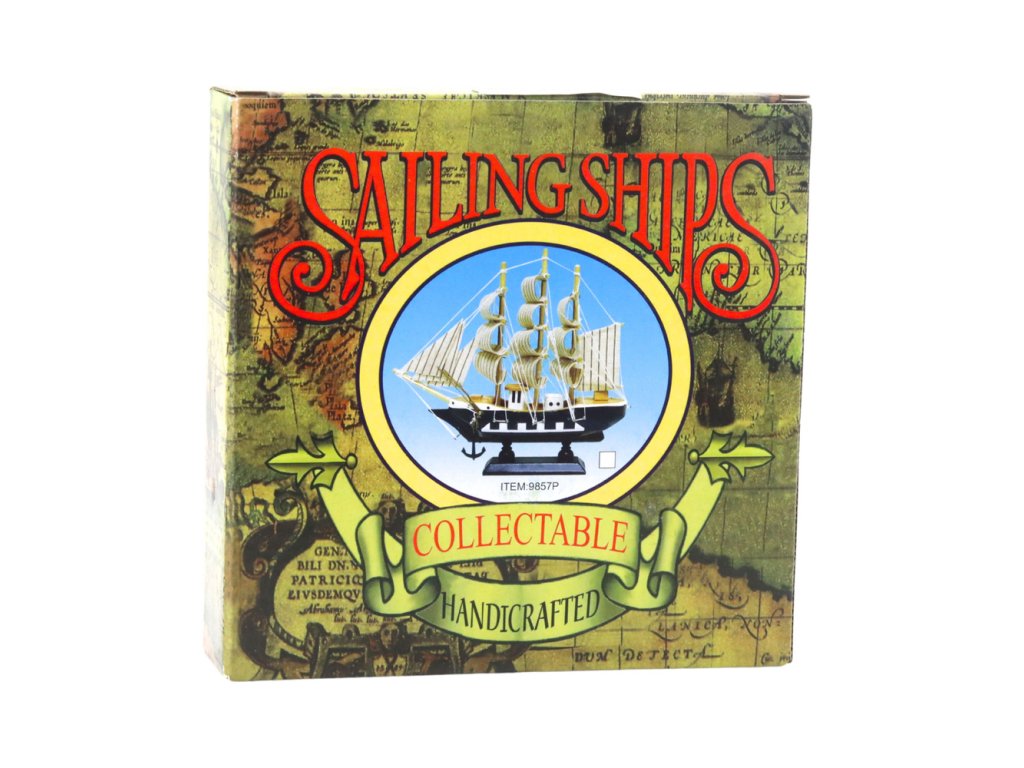 Bílý trup s černým pruhem a intenzivně modrý interiér vynikají mezi ostatními modely a tvoří lehký, dekorativní akcent v stylu přímořských přístavů Charakteristické textilní plachty s modrými pruhy a pečlivé lanoví zdůrazňují jeho výstavní charakter a evokují vzpomínky na mořskou brízu a otevřený oceán