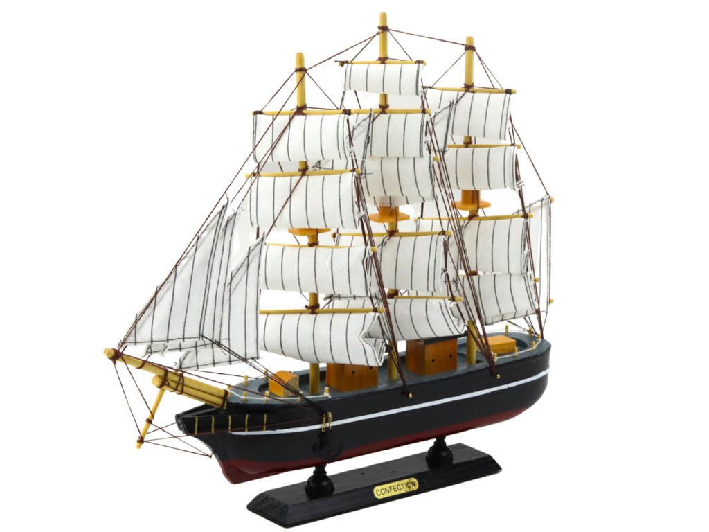 - Černý a červený trup s jemnými zlatými detaily a bílé textilní plachty vytváří elegantní kontrast, který doplní vaše interiéry v klasickém, vintage nebo marynistickém stylu
