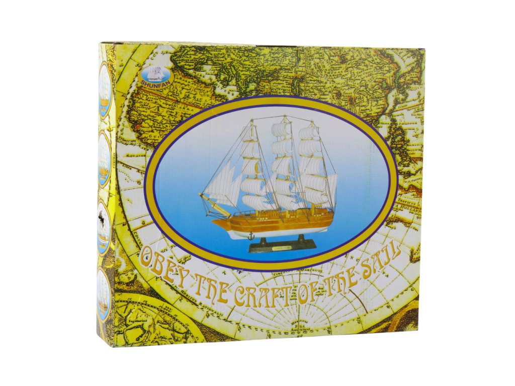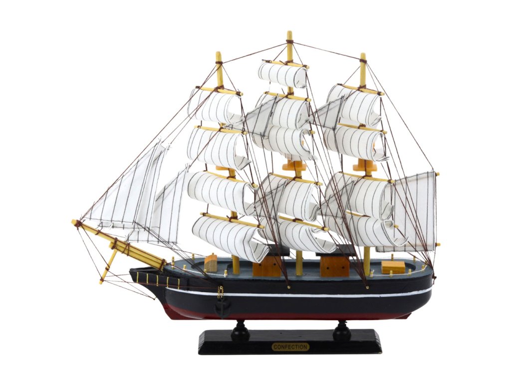 Model trojstěžňové plachetnice inspirovaný historickými jednotkami z doby velkých výprav a námořního obchodu je výjimečným dekorativním prvkem s vysokou úrovní detailní reprodukce Loď se vyznačuje klasickou linií trupu v tmavém barevném provedení, trojstěžňovou konstrukcí s plným oplachtěním a ručně zpracovaným lanovím