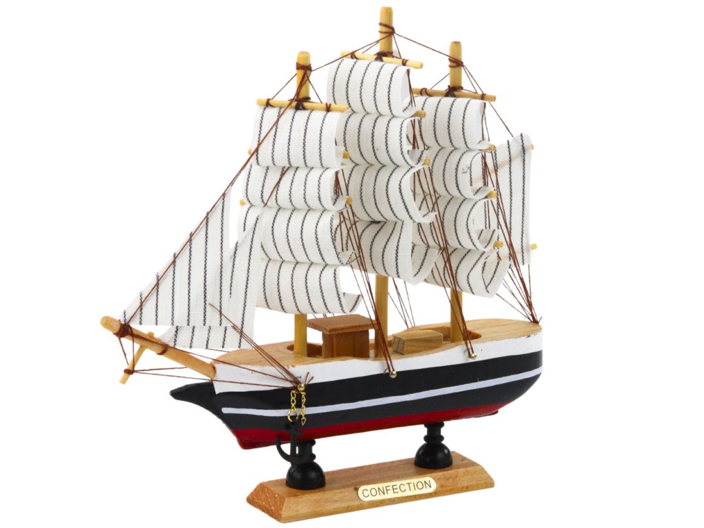Model trojstěžňové plachetnice - sběratelská replika v černobílém provedení Tento kompaktní model trojstěžňové plachetnice je elegantní replika klasické plachetnice s dynamickým, štíhlým profilem.