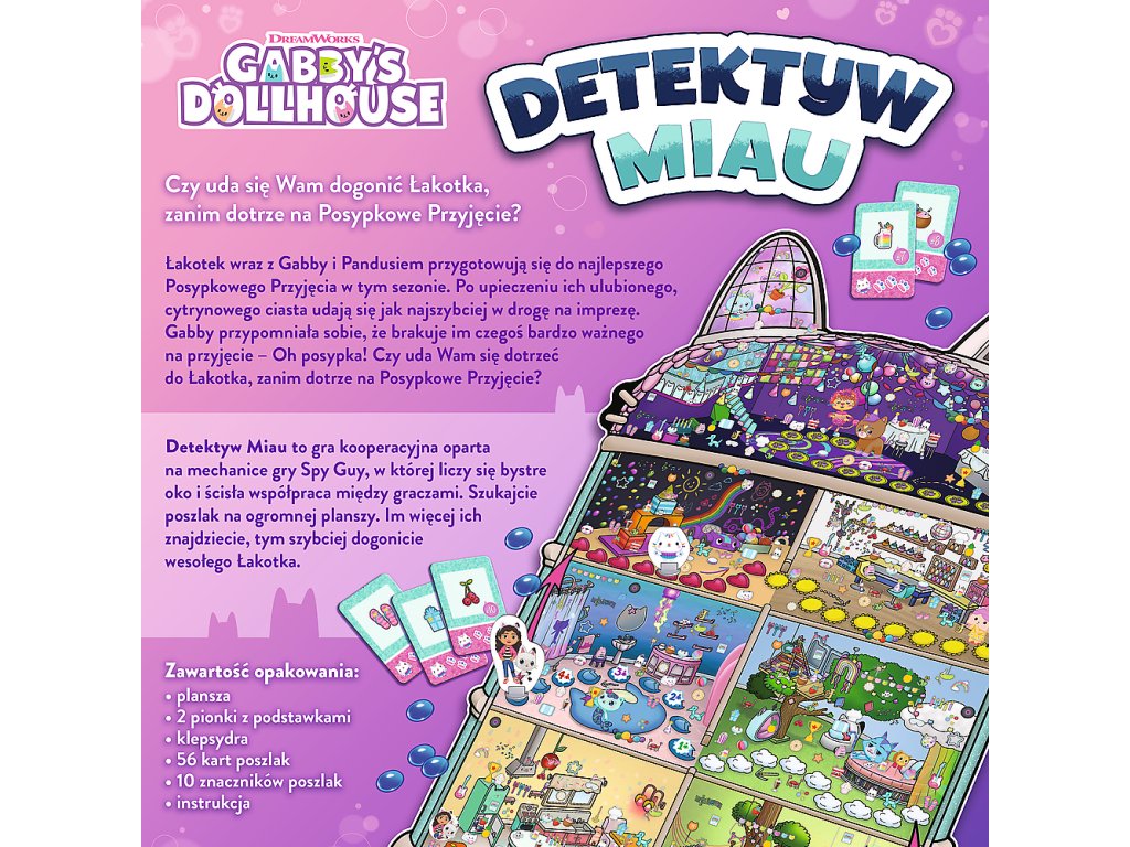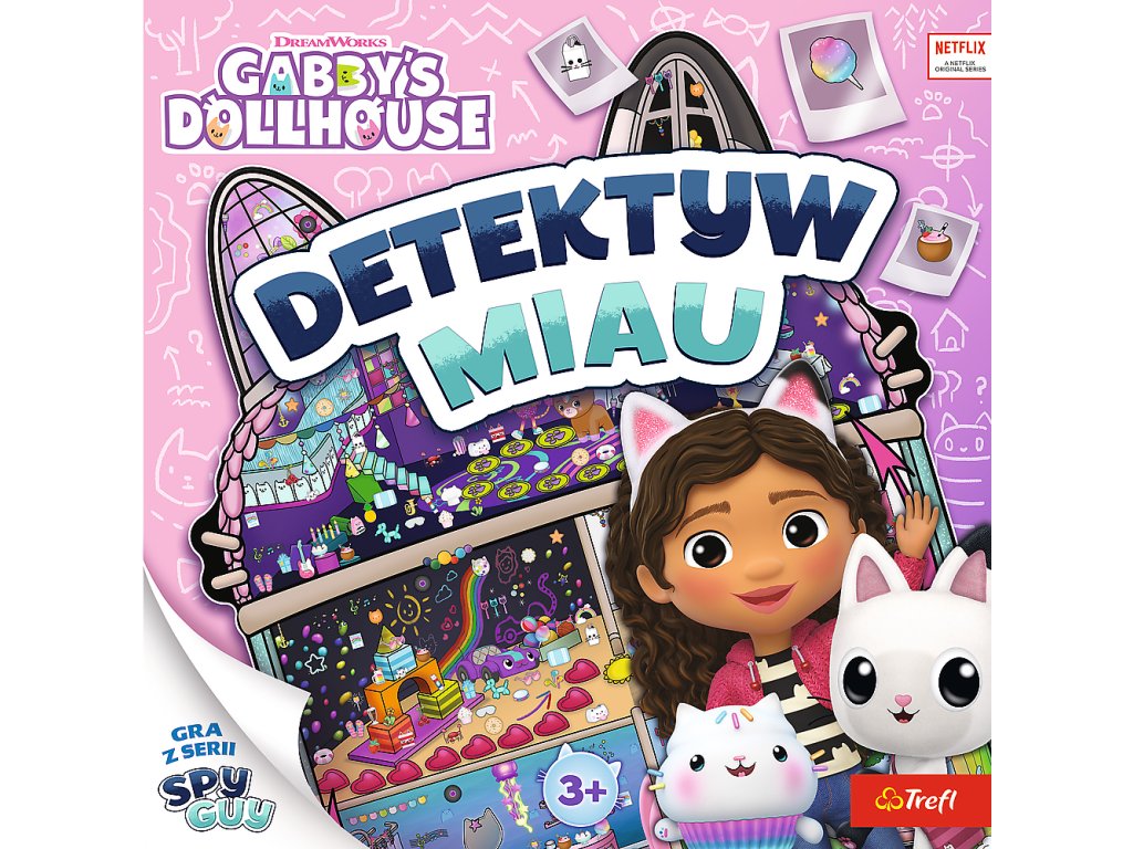 Detektiv Mňauk je zasazen do pohádkového světa Kočičího Domečku Gabi jako projekt kooperativní pozorovací hry ze série Spy Guy Dokážete chytit kočku Lákotka dříve, než se dostane na Posypkovou Párty bez nejdůležitějšího doplňku do dortu?