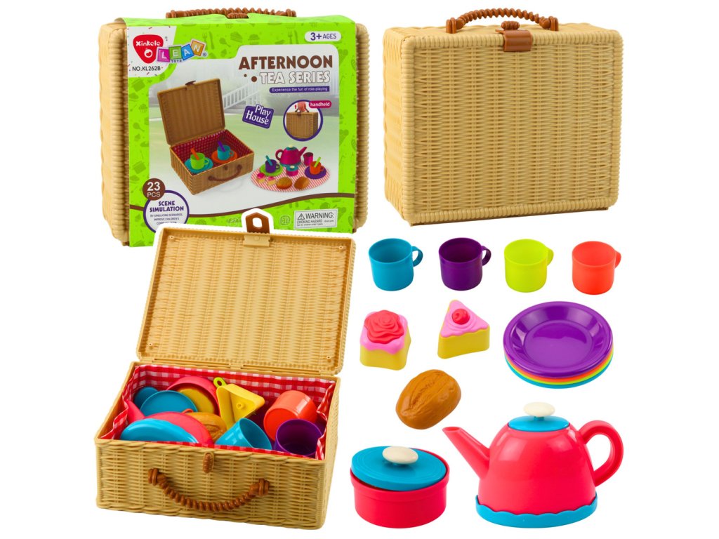 Zestaw Do Herbaty w Koszyku Filiżanki Talerzyki Słodkości 23 el. je báječný dárek pro každé dítě, které miluje hrát si na různé role, organizovat večírky a rozvíjet svou představivost prostřednictvím kreativní hry. Tento kvalitně navržený set obsahuje barevné šálky, talířky, čajník, hrneček a sladkosti, které umožňují vytvářet nekonečné scény během hry na domácnost, restauraci nebo čajový dýchánek. Všechny součásti jsou vyrobeny z lehkého, odolného materiálu, což zaručuje, že jsou bezpečné a pohodlné pro malé ručičky.