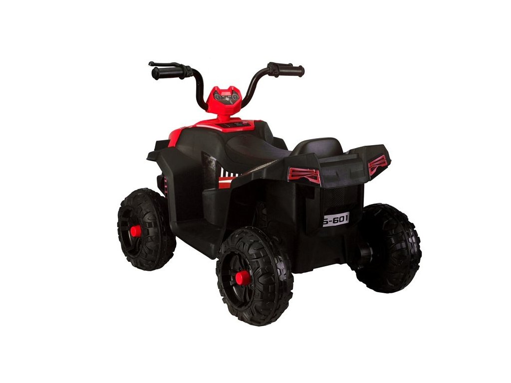 - Červený quad S601 s černými kontrastními doplňky je poháněn akumulátorem 6V4,5Ah, který v kombinaci s dvojitým motorem 35W poskytuje radostnou a pohodlnou zábavu