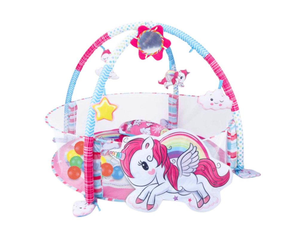 - Tato roztomilá, barevná podložka s motivem jednorožce kombinuje hned tři funkce: klasickou edukační podložku s oblouky a závěsnými hračkami, suchý bazén s míčky a měkký prostor pro válení se a nácvik samostatného sezení