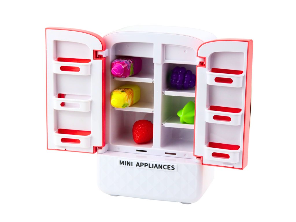 - Lednička je vybavena dvěma otevíratelnými křídly dveří, díky nimž dítě může snadným a intuitivním způsobem ledničku otevírat a zavírat, vkládat a vyjímat miniaturizované produkty