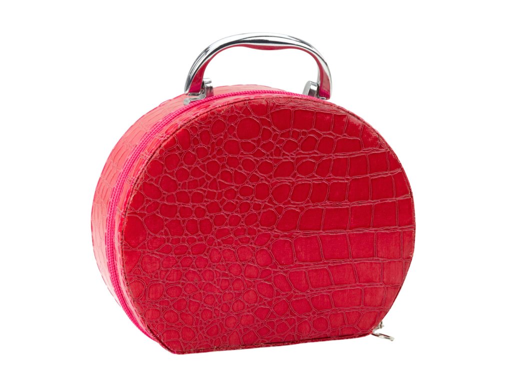 - Červená kosmetická taštička s stylovým koženým vzhledem zahrnuje škálu barevných očních stínů, třpytivé laky na nehty, rtěnky a další doplňky, které umožní vaší dceři cítit se jako skutečná stylistka