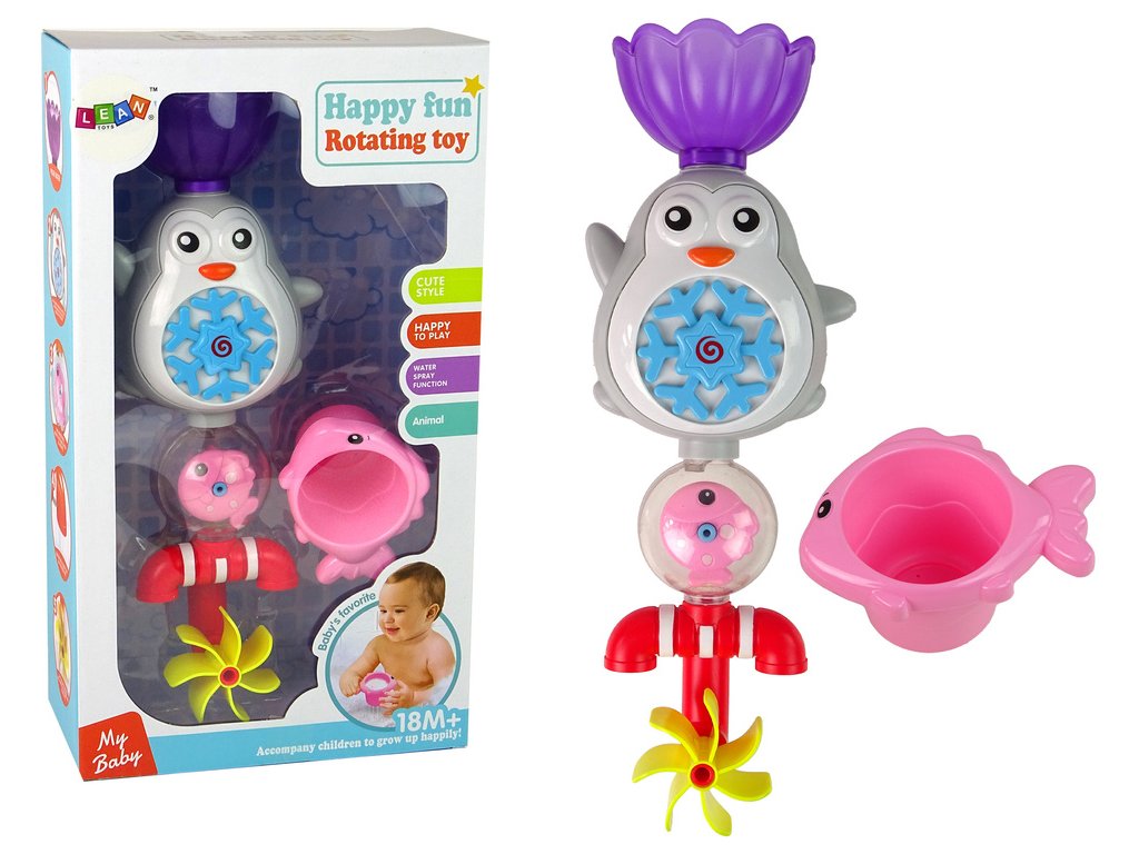 Na vrcholu hračky je fialový květ, do kterého stačí nalít vodu a ta chytře proteče celou hračkou a spustí magické pohyby a zábavné efekty Tučňák je středem pozornosti, jeho bříško skrývá otočnou sněhovou vločku, která děti vtáhne do víru roztomilých otočných pohybů