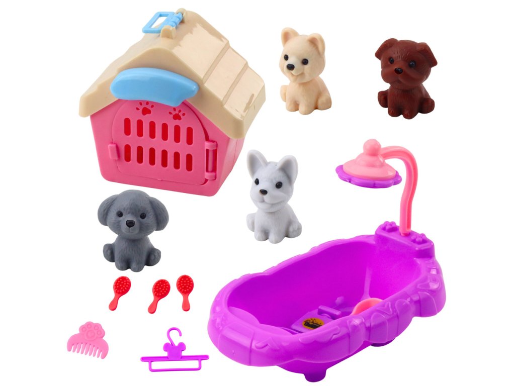 Dětská sada péče o mazlíčky: vana, domeček a 4 psí figurky