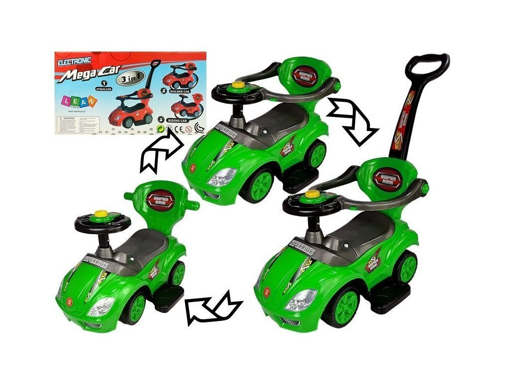 - 3v1 Mega Car Dětské autíčko s tlačnou rukojetí Mega Car bylo navrženo pro energické batolátka, která milují pobyt na čerstvém vzduchu