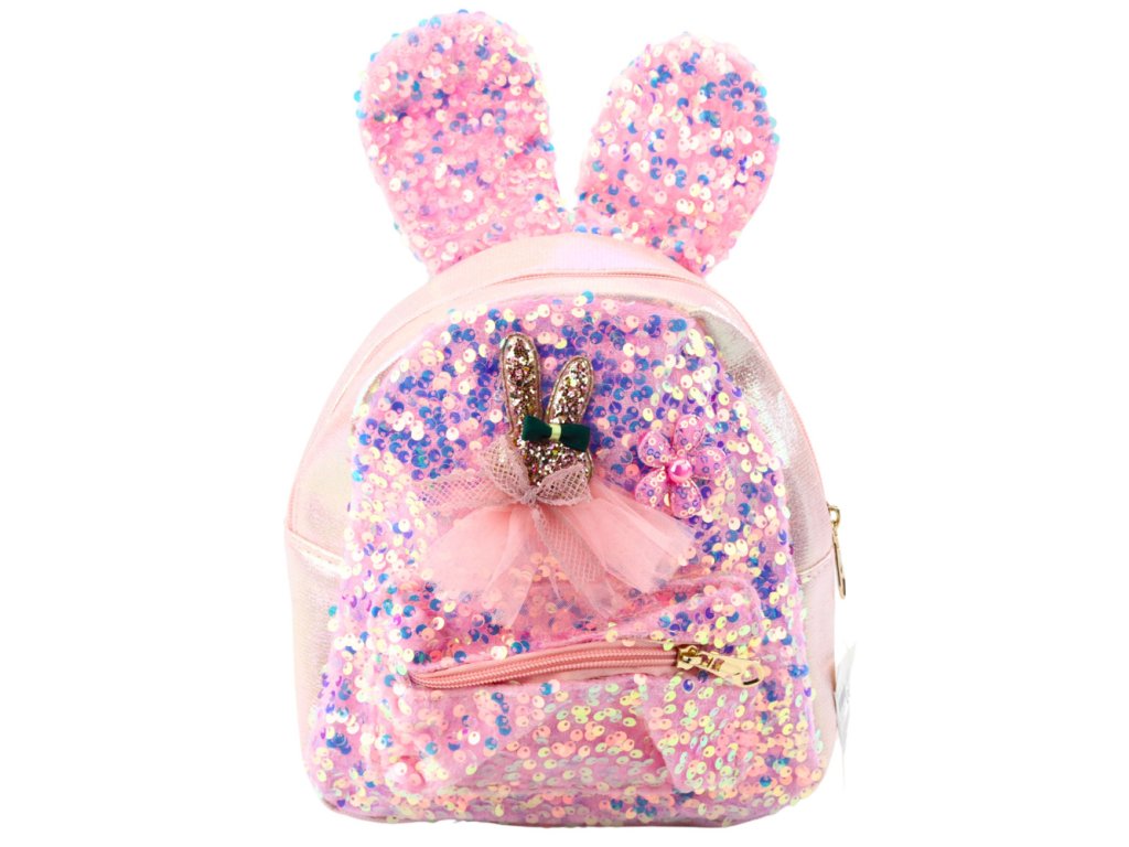 Roztomilý dětský batoh růžové barvy s flitrovými aplikacemi a dekoračními zaječími ušima je stylový a praktický doplněk pro všechny malé milovnice třpytivých detailů.